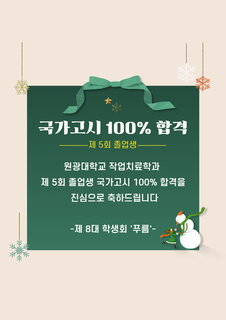 제 5회 작업치료학과 선배님들의 국가고시 100% 합격이라는 기쁜 소식을 전해드리게 됐습니다! 힘든 시기가 와도 멋있게 달려오신 선배님들의 의지와 언제나 든든하게 지지해주신 교수님들 덕분에 작년에 이어 무려 4년 연속 국가고시 100% 합격이라는 멋있는 성과를 보이게 되었습니다. 앞으로도 언제나 선배님들의 밝은 미래를 응원하고 본받는 학생회 ‘푸름’이 되도록 하겠습니다!