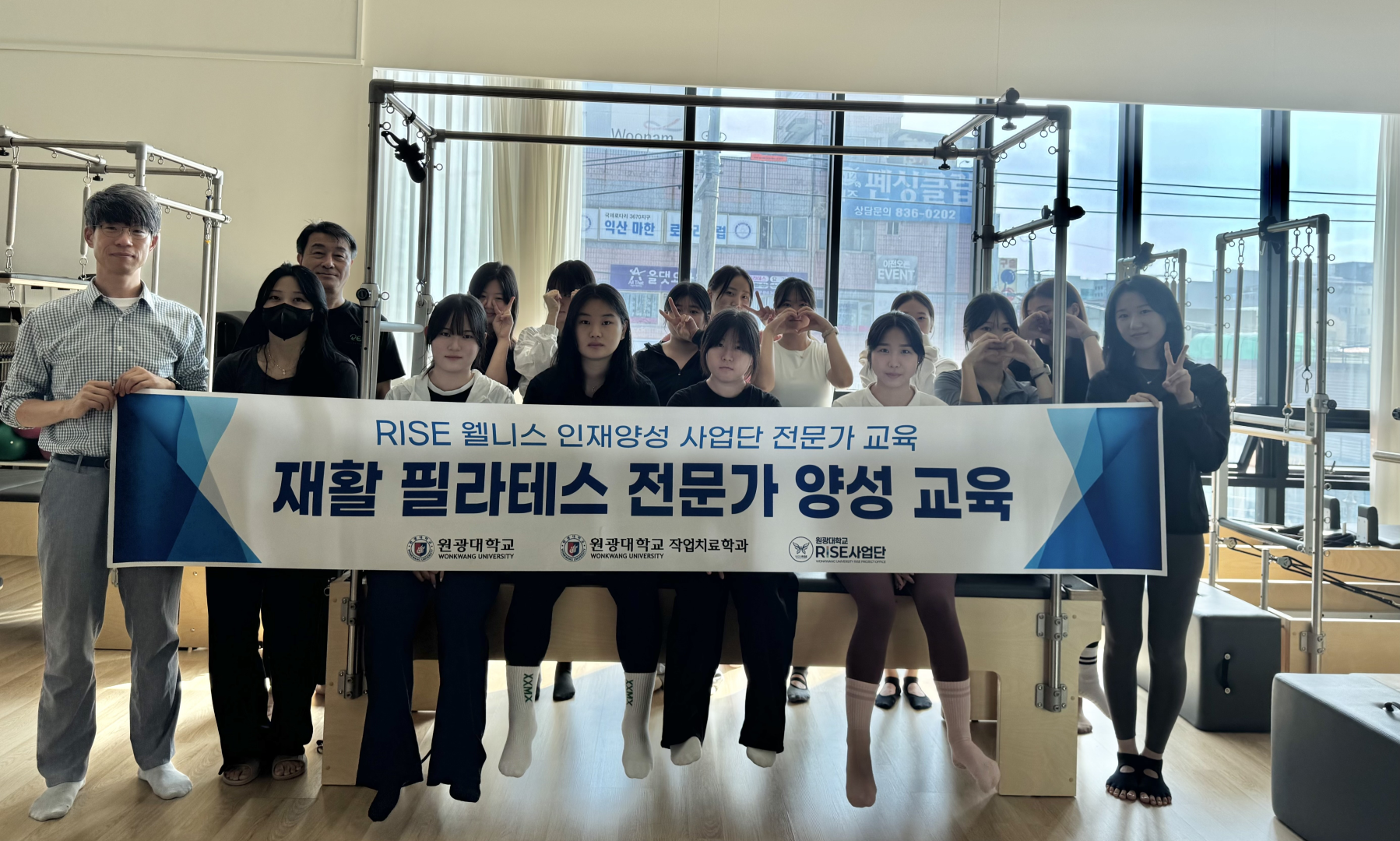 원광대학교 작업치료학과는 RISE 웰니스 인재양성 사업 지원과 리앤리 필라테스와 연계 과정을 통해 2025년 “재활 필라테스 전문가 교육”을 진행중이다. 프로그램은 매트 필라테스와 기구 필라테스로 구성되어 노인 및 장애인의 건강 관리를 위한 전문가 양성 과정으로 이루어진다. 재활 필라테스 전문 강사의 지도와 교육으로 작업치료학과 2~4학년 학생들이 참여 중으로 교육 후 전문 자격증 취득으로 이어지는 전문 과정이다.