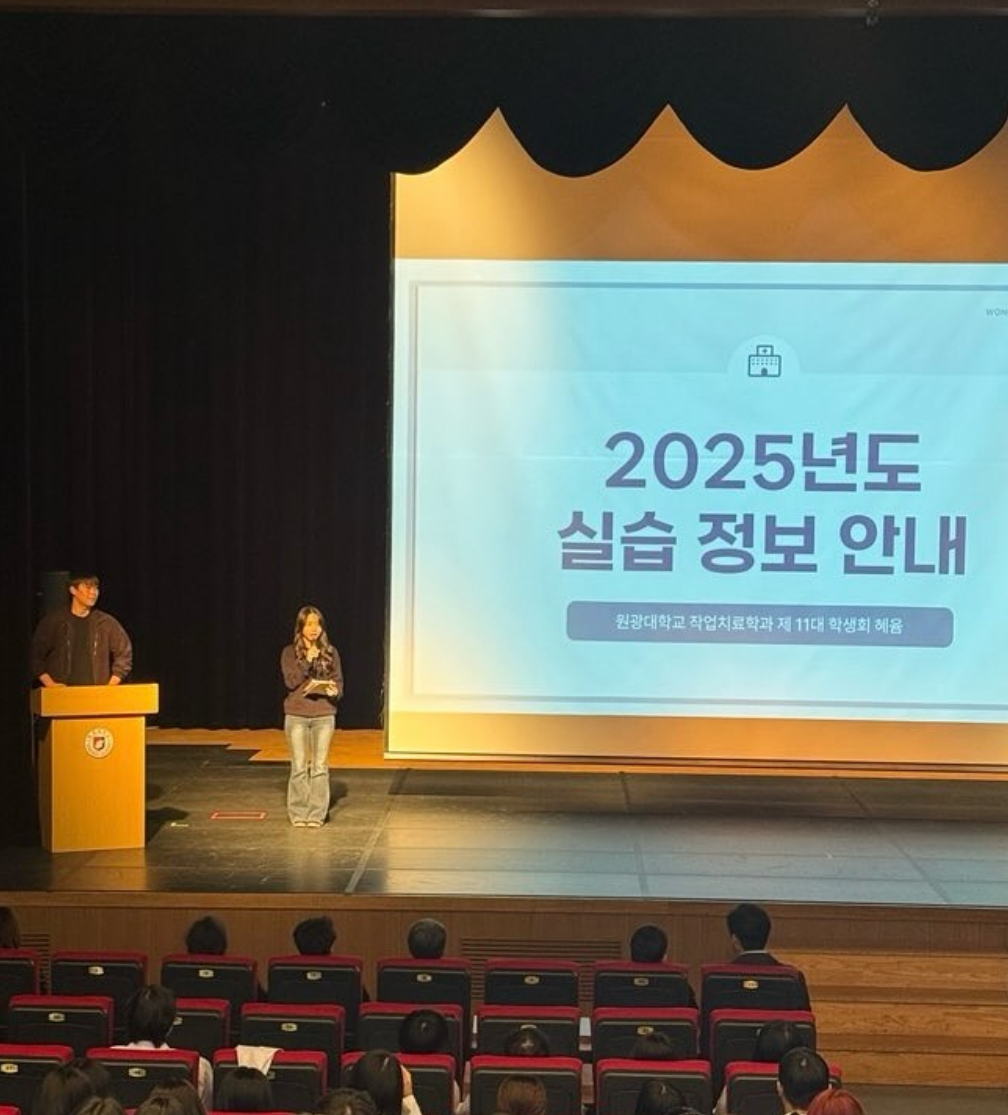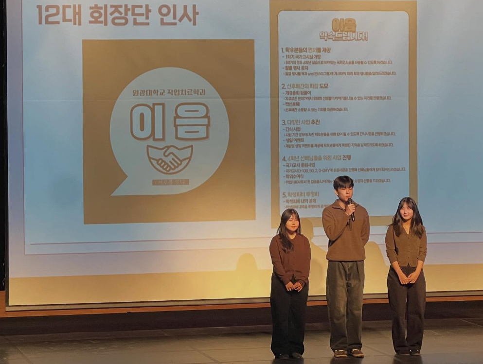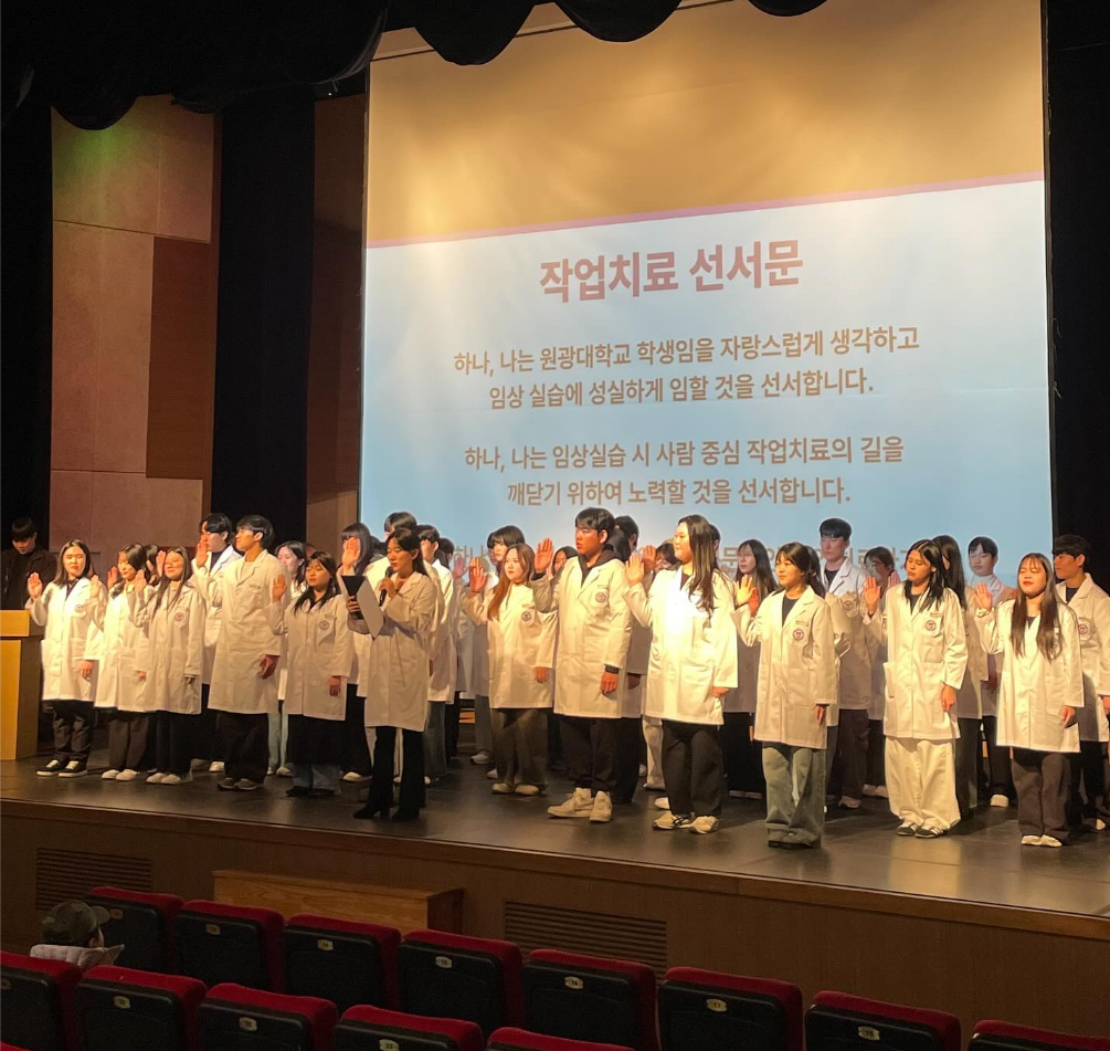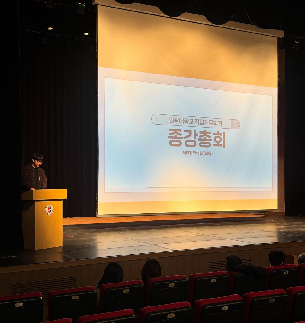✨안녕하세요 제11대 학생회 혜윰입니다✨ 2025학년도 11월 12일 작업치료 선서식 및 종강 총회가 진행되었습니다. 학과 교수님들께서 직접 가운에 명찰을 달아주시며 따뜻한 격려와 응원의 말씀을 전해주셔서, 종강 총회에서는 2학기동안 진행된 학과 행사와 동아리 활동을 함께 돌아보며, 2026년 한 해를 새롭게 이끌어갈 12대 학생회 “이음”의 당선 인사와 한 해 동안 학과를 위해 열심히 활동해준 11대 학생회 “혜윰”의 마지막 인사, 학생회비 사용 내역 보고로 마무리하였습니다. 행사에 함께해 주신 모든 학우분들께 감사드리며,