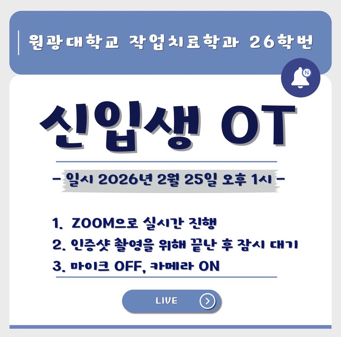 안녕하세요! 제12대 학생회 ‘이음’입니다. 곧 있을 신입생 OT에 대해 안내드립니다. ✅ 일정 안내 * 일시: 2026. 02. 25. (수) 오후 1:00 * 방식: 온라인 ZOOM 화상 회의 ✅ 유의사항 * 원활한 진행을 위해 카메라 활성화 및 마이크 음소거 상태를 유지해 주세요. ✅ 주요 내용 * 학과 소개 * 수강신청 안내 * 동아리 소개 등등 🔗 접속 방법: 당일 오전 신입생 단톡방에 링크 공지 예정 (미참석자를 위해 추후 단톡방에 OT 자료가 공유됩니다.) 신입생 여러분의 많은 참여 바랍니다. 감사합니다. |