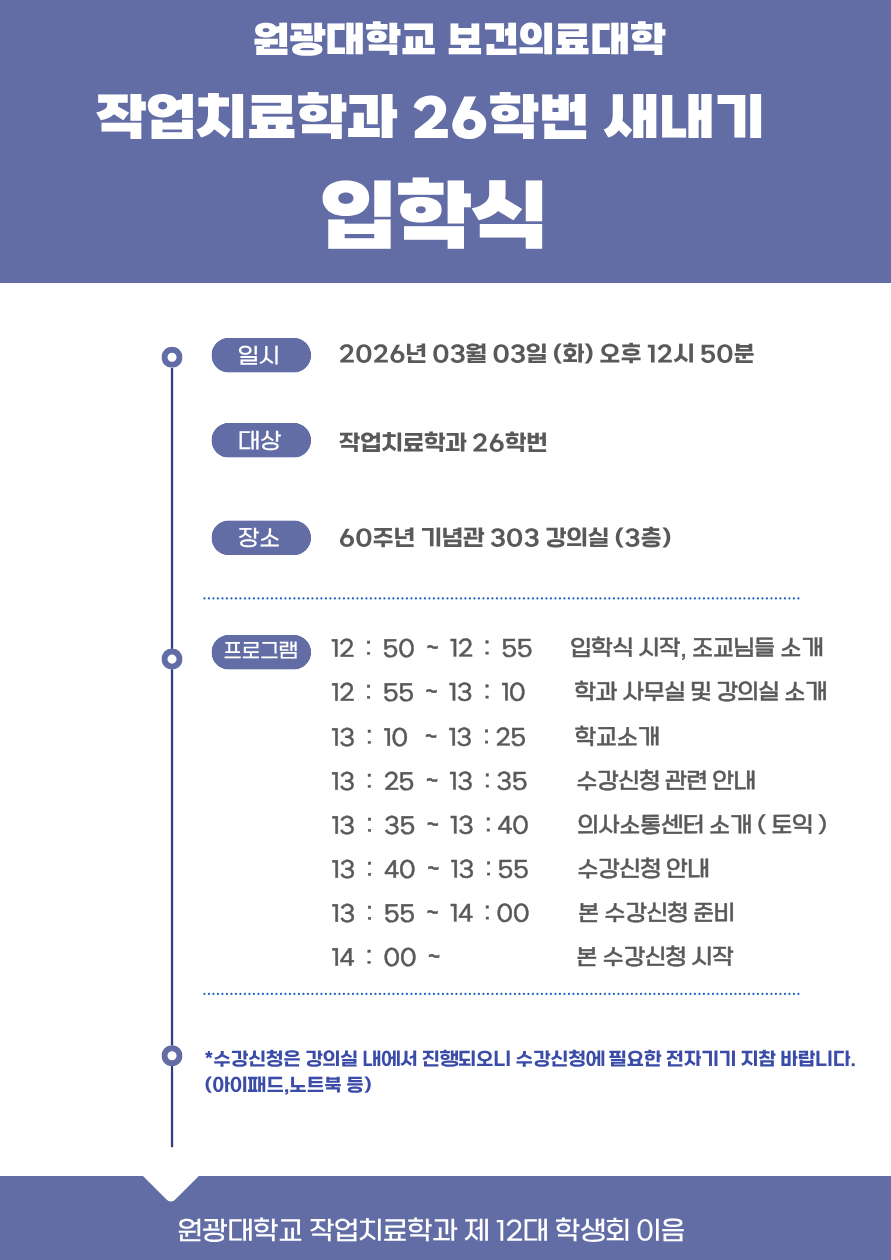 안녕하세요 제 12대 학생회 ‘이음’입니다. 2026년 3월 3일(화) 진행되는 📍 일시 📍 장소 이번 입학식에서는 조교님 소개, 학과 및 학교 소개, 수강신청 안내 등이 진행될 예정입니다. 이후 오후 2시부터 본 수강신청이 시작됩니다. 원활한 수강신청을 위해 노트북, 태블릿 등 전자기기를 반드시 지참해 주세요. 대학생활의 첫 시작을 함께하는 자리인 만큼, 많은 관심과 참여 부탁드립니다 🤍 신입생 여러분의 새로운 출발을 진심으로 환영합니다! 저희 학생회 [이음]이 여러분의 첫걸음을 함께하겠습니다. |